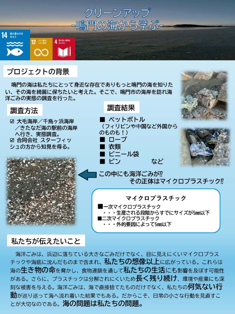 海の環境に関心を持った学生がフィールドワークを通じて見たもの、気づいたこと、そして課題解決に向けてやるべきことをポスターにまとめてくれました。
